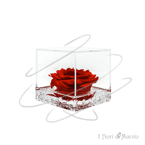 Composizione in vaso di vetro composta da una rosa stabilizzata (Rosa vera disidratata e trattata in modo che la sua durata sia di diversi anni). La composizione comprende la rosa stabilizzata, il vaso di vetro, la sabbia colorata ed eventuali decorazioni aggiuntive.